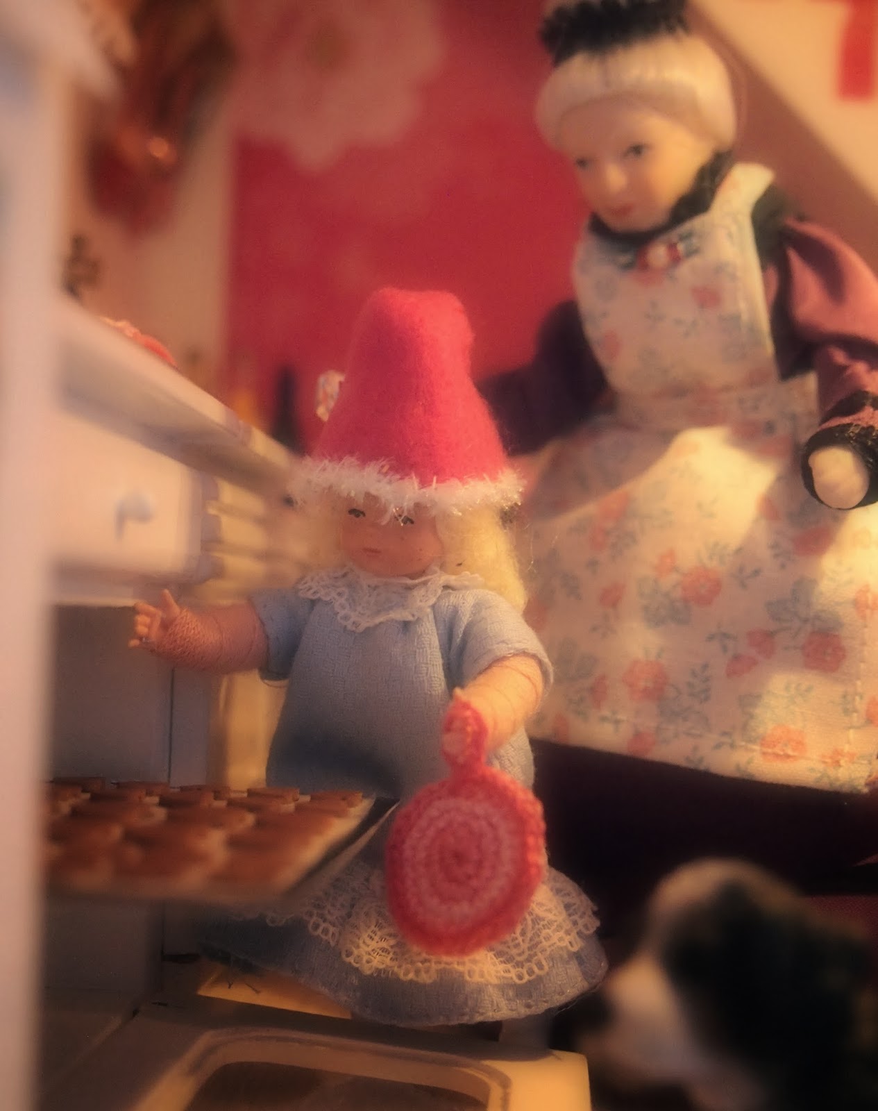 Mummo on tehnyt piparkakkutalon tytöille. Minni leikkii, että piparkakku-ukko asuu talossa.